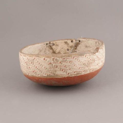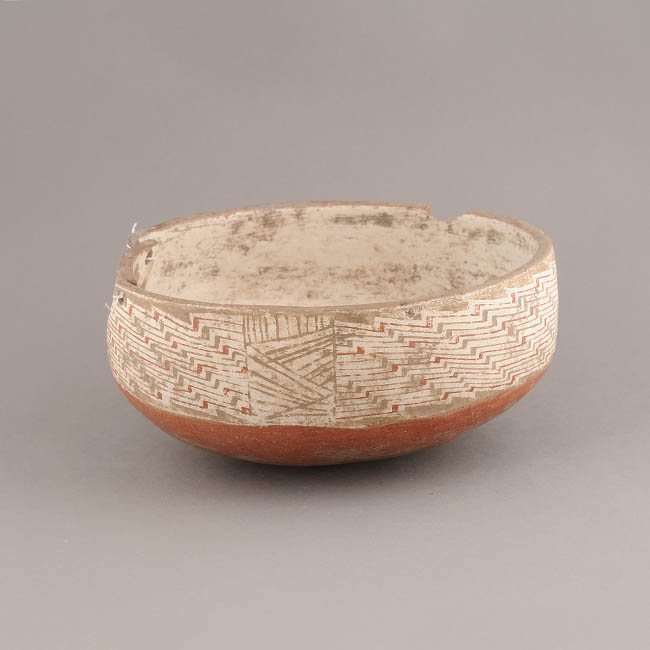 Vasija simétrica, no restringida, de perfil compuesto. El borde es directo con labio recto, cuerpo subcilíndrico y base subesférica. Ambas superficies están pulidas: la interior posee engobe blanco; la exterior presenta la base con engobe rojo y el sector superior está decorado con una banda pintada con motivos continuos negros y rojos sobre engobe blanco. Un sector de la pieza presenta un sector faltante, el que ha sido reemplazado con un fragmento de otra pieza, el que fue unido mediante tres agujeros de reparación.