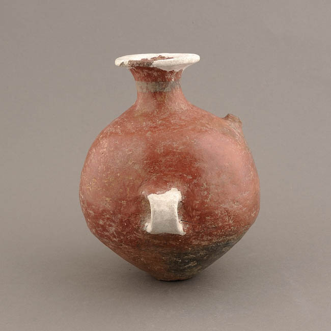 Vasija simétrica, restringida independiente (con cuello), contorno complejo. Cuerpo subesférico, cuello hiperboloide, base cónica invertida, dos asas verticales tipo arco de correa emplazadas cuerpo-cuerpo. La superficie exterior se encuentra pulida y engobada rojo; interior alisada, excepto en el borde y principio del cuello. Además, presenta un mamelón en la parte superior del cuerpo.