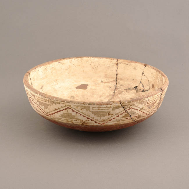 Vasija simétrica, no restringida, de perfil compuesto. Borde directo evertido con labio convexo, cuerpo subcilíndrico, base convexa. Ambas superficies están pulidas: la interior presenta engobe blanco; y la exterior presenta la base con engobe rojo y el cuerpo decorado con diseños polícromos sobre engobe blanco.