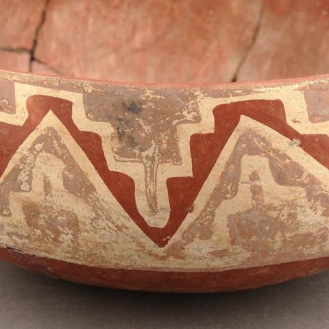 Vasija simétrica, no restringida, de perfil simple. El borde es directo con labio convexo, cuerpo elipsoidal y base convexa. Ambas superficies están pulidas: la interior posee engobe rojo; la exterior presenta la base con engobe rojo y el sector superior está decorado con una banda pintada con motivos geométricos y escalerados continuos cafés y rojos sobre engobe blanco.