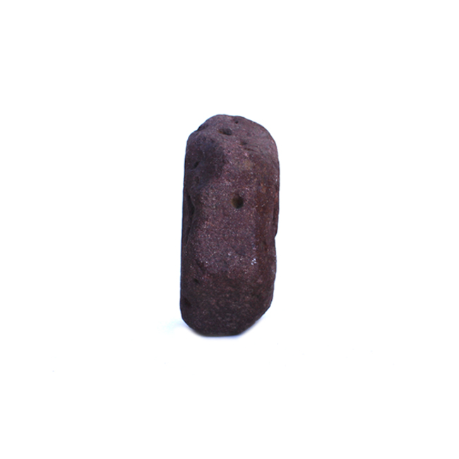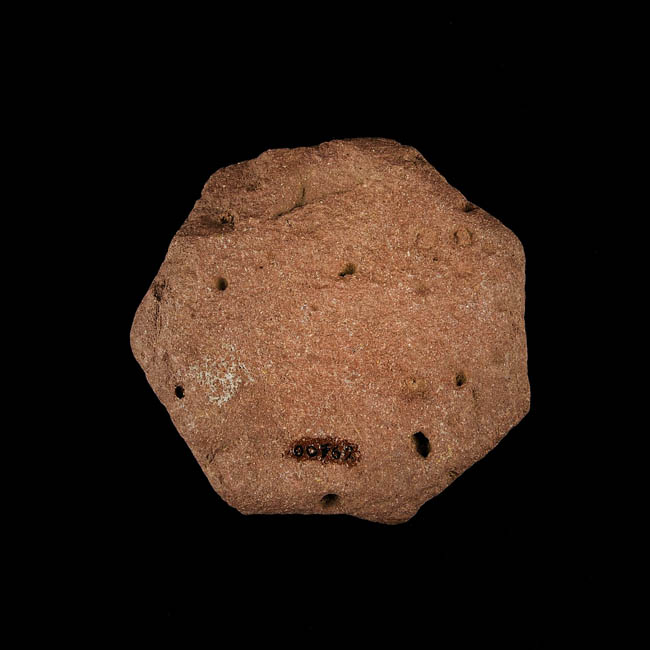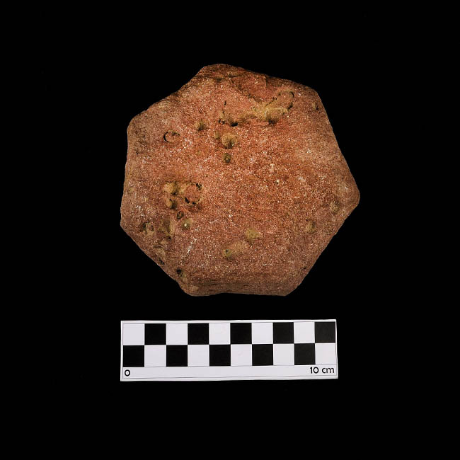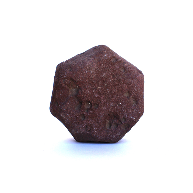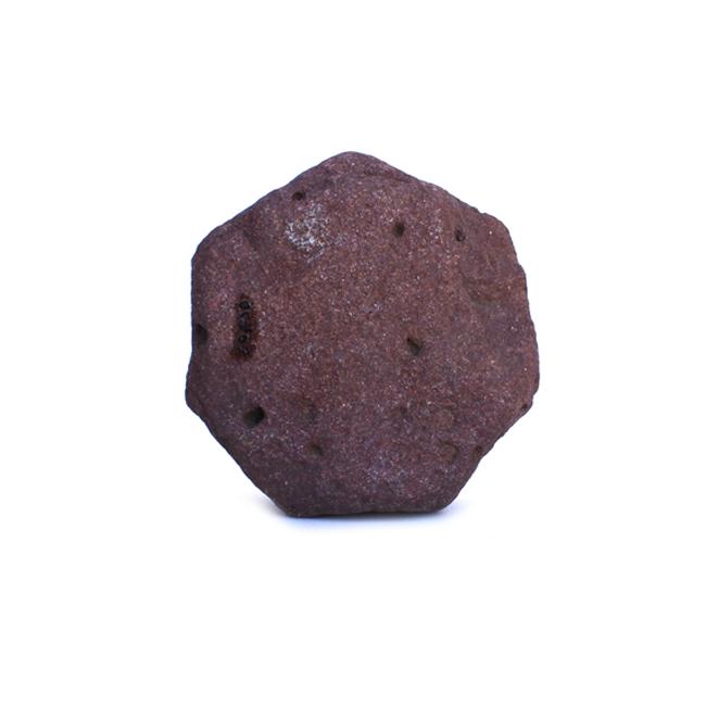 Lito geométrico. Objeto de forma aplanada y heptagonal, con paredes laterales levemente cóncavas .Superficie irregular, de un color rojizo. Se aprecian 7 lados en su estructura.