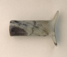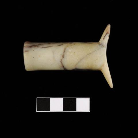 Adorno facial (bucal) elaborado en una piedra color blanco con vetas negras. Objeto macizo, que posee forma cilíndrica, donde uno de sus extremos finaliza en dos protuberancias planas, de extremos redondeados, que se prolongan hacia lados opuestos.
