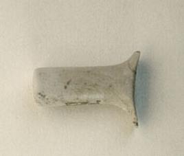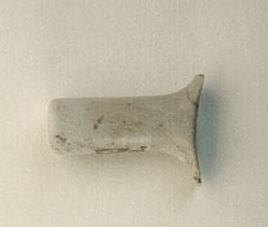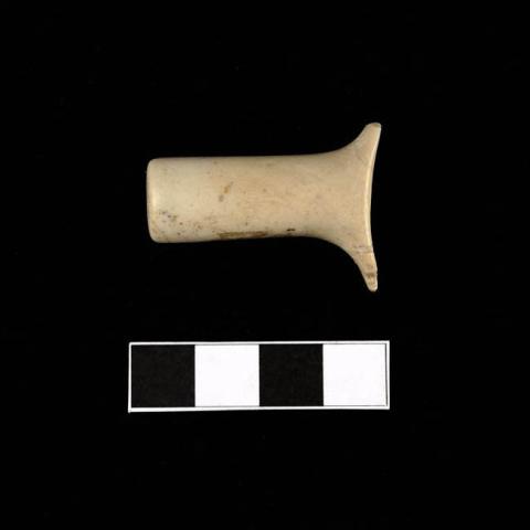 Adorno facial (bucal) elaborado en una piedra color blanco con vetas negras. Objeto macizo que posee una forma cilíndrica y que finaliza en dos aletas.