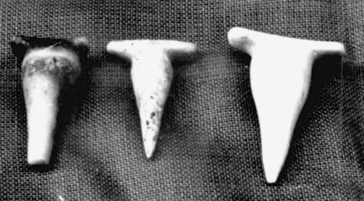 Objeto de uso personal. Adorno facial que se usa inserto bajo el labio inferior. Tiene forma triangular alargada y remata en dos aletas contrapuestas. Superficie pulida de color beige con vetas marrón oscuro