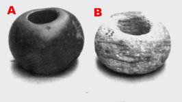 Instrumento de forma cilíndrica, de bordes redondeados, con perforación bicónica en el sector central. Piedra pulida de color gris claro con vetas de color marrón.