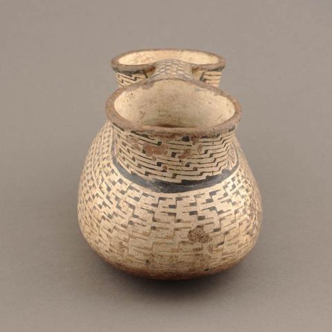 Contenedor restringido de perfil compuesto. Tiene dos cuellos cilíndricos unidos por un asa puente de borde a borde, ambos contrapuestos sobre un cuerpo ovoidal de orientación horizontal con base curva. Se encuentra decorado con pintura roja y negra sobre engobe blanco en patrones concatenados que cubren desde el inicio del cuello hasta la parte baja del cuerpo; en el asa está decorado con ajedrezado en blanco y negro a seis bandas paralelas, y sobre la parte superior del cuerpo tiene una banda negra dividida en tres triángulos a cada lado, que representan un rostro antropomorfo estilizado con ojos concéntricos de color rojo y boca con dientes radiantes hacia el interior.