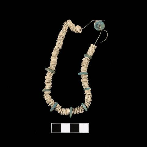 Adorno de uso personal que se usa en torno al cuello y pendiente sobre el pecho. Objeto elaborado en múltiples cuentas discoidales e irregulares perforadas en el sector central, elaboradas en malaquita, crisocola y concha.