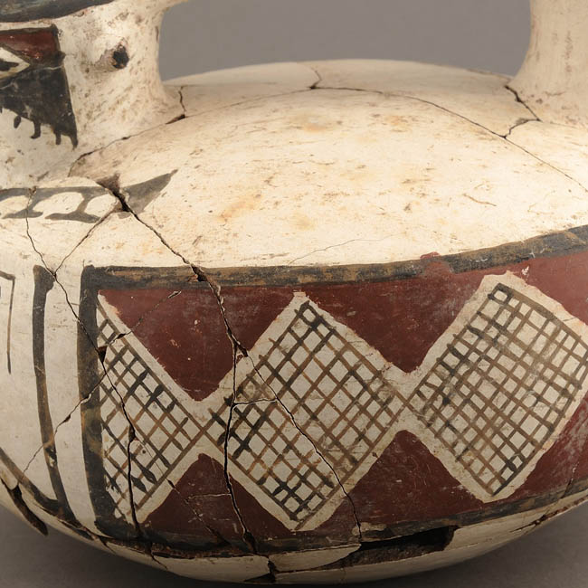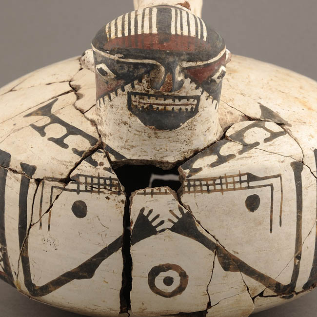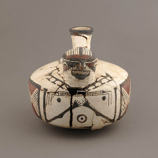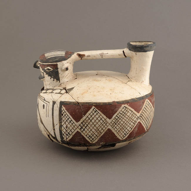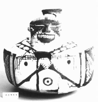 Vasija antropomorfa, asimétrica, restringida con cuello, de perfil complejo. El cuerpo es de forma elipsoide horizontal y el cuello es de forma cónica invertida. El asa es recta y une el cuello con el aditamento antropomorfo en modelado. La decoración se encuentra en el cuerpo y el cuello y es de tipo geométrica lineal. El modelado de la cara (Aditamento) se encuentra decorado con pintura.