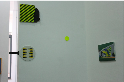 Instalación compuesta por cuatro componentes que se disponen sobre dos muros que se interceptan en una esquina. Uno de ellos consiste en una pintura acrílica sobre tabla en la que se representa la caída de un motorista, vestido con traje amarillo y azulino, botas de color blanco y azul y casco amarillo fluor con líneas de color negro. Al muro de la izquierda se montan 3 elementos, consistentes en un círculo de poliuretano expandido de color amarillo fluor, un trozo de madera aglomerada con un lado irregular, pintado con franjas de color amarillo fluor y negro de forma diagonal, y finalmente una paleta de playa de madera de color blanco con mango negro, decorada con motivos triangulares en color negro y amarillo. El montaje deja el mango de la paleta en el aire, sobresaliendo del muro.
