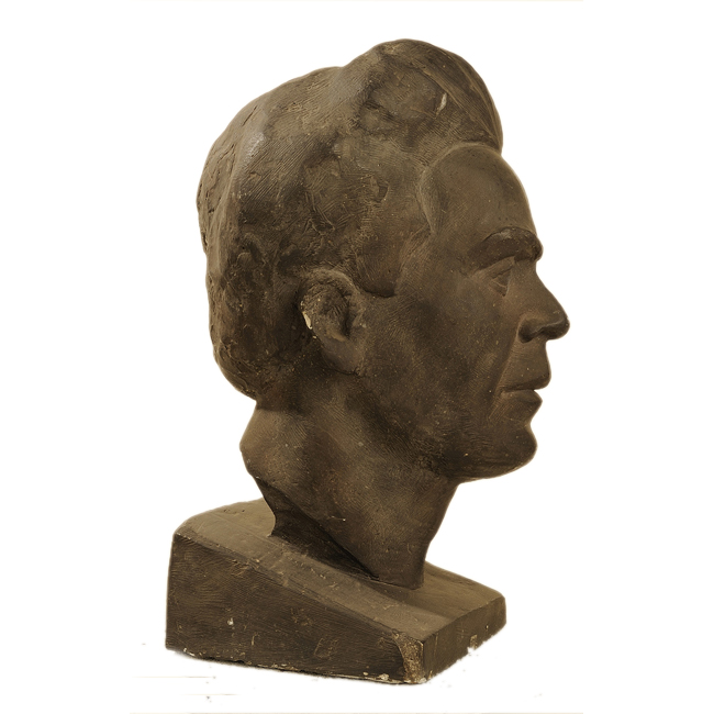 Cabeza masculina de cejas gruesas y sobresalientes, abundante cabello peinado hacia atrás. Base rectangular.
