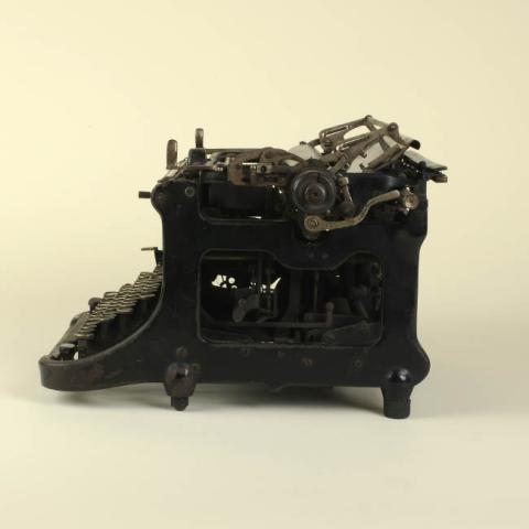 Objeto semi rectangular macizo, con teclado compuesto por perillas redondeadas al frente, parte superior especie de regla y rodillo movible, parte posterior mecanismo y piezas al descubierto.