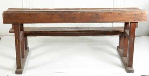 Objeto formado por dos cuerpos separados, que se sujetan sobre dos soportes de madera sobre el piso. El cuerpo más alto tiene una cubierta de madera a modo de mesa, con ranuras. El cuerpo menor se encuentra ensamblado al mueble en posición horizontal y tiene la misma forma del cuerpo alto.