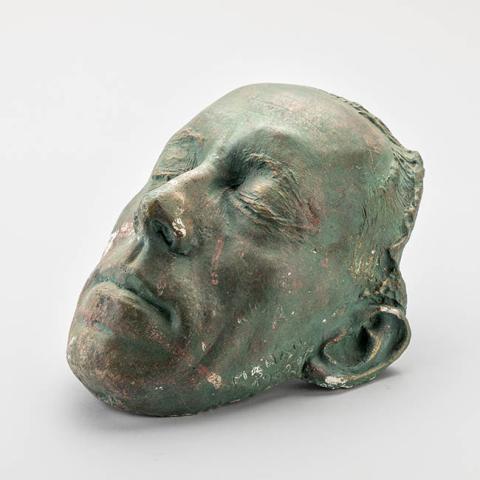 Rostro humano masculino convexo, de contextura delgada, labios grandes, ojos cerrados, con arrugas muy marcadas, frente prominente.