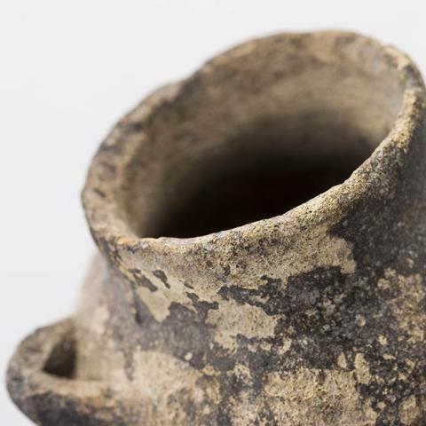Recipiente pequeño de cuerpo semi esférico y base convexa, cuello ancho. Tiene un asa horizontal en el recipiente.