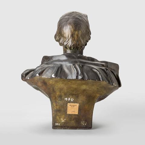 Obra exenta, figura masculina de busto, lleva bigotes, viste camina, corbata de lazo y chaqueta de solapa ancha, sobre los hombros una capa drapeada. Base cuadrada con inscripción.