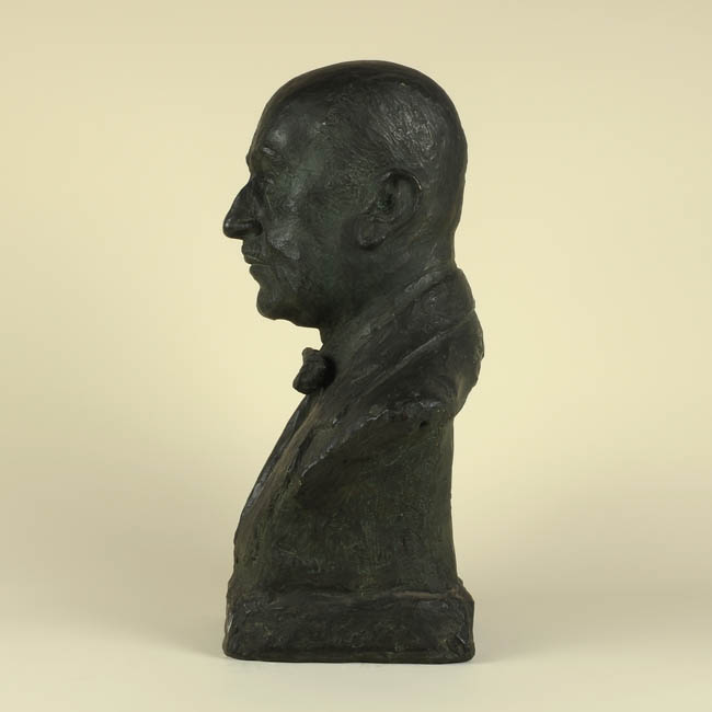 Obra exenta, busto de figura masculina. Posición frontal, presenta calvicie y lleva bigotes. Viste camisa con cuello, cortaba de humita y chaqueta con solapas. Se sustenta sobre una base rectangular incorporada al volumen.