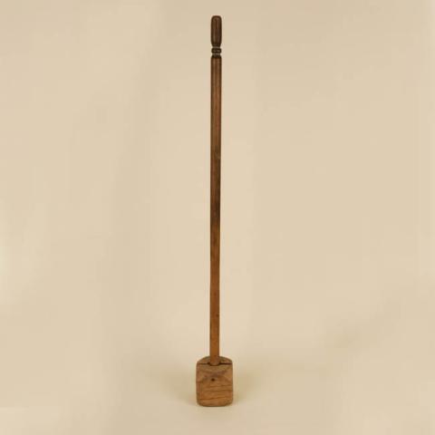 Objeto de madera formado por un mástil largo que en uno de sus extremos tiene una cabeza cúbica. Es pesado y se utiliza regularmente para golpear alimentos, como la carne.