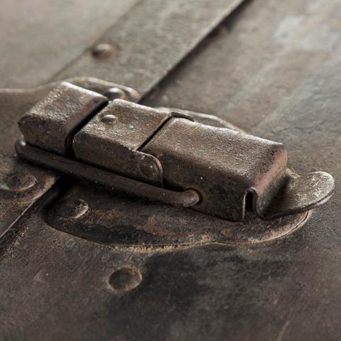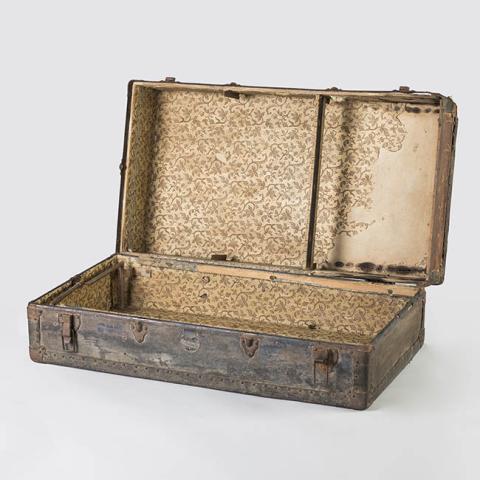 Objeto rectangular, compuesto por dos partes, unidas por un solo lado. Tiene bordes de metal, tapizado interior. Por el interior, en uno de los extremos, tiene dos palancas de fierro que se abren y cierran.