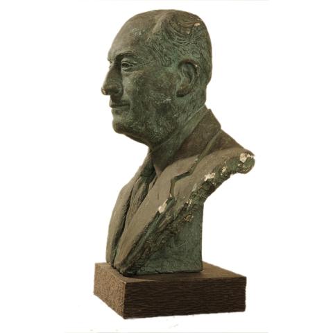 Obra exenta. Figura masculina de busto, cabello peinado hacia atrás. Viste camisa, corbata y chaqueta con solapas amplias. El volumen se sustenta sobre una base de forma cuadrada.