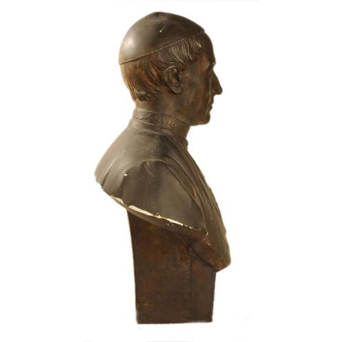 Obra exenta, figura masculina de busto, lleva casquete sobre la cabeza y viste alzacuello y hábito religioso, en el costado izquierdo del pecho lleva una cruz. El volumen descansa sobre una base rectangular.