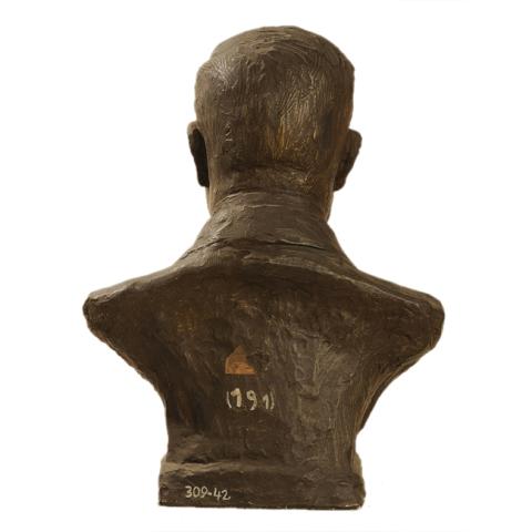 Obra exenta, composición en base a busto masculino de cabello corto peinado hacia un costado, tiene bigotes. Viste chaqueta y corbata.