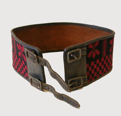 Prenda de vestir alargada, hecha de cuero y decorada en toda su parte externa por un tejido en base a cuadrados y flores en color rojo con negro. Se abrocha mediante correas con hebillas dobles.