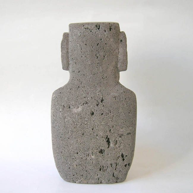 Figura decorativa antropomorfa elaborada en piedra volcánica. Se compone de una cabeza de forma subrectangular (nariz y frente prominentes), unida a un tronco alargado. No se registran brazos ni piernas.
