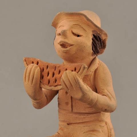 Figura masculina sentada de cerámica, viste pantalón corto y camisa, lleva sombrero y ojotas, está sentado con con trozo de sandía en las manos. Pelo pintado café y sandía anaranjada.