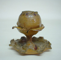 Figurilla decorativa que representa un mate de greda policromada color ocre, tiene cuerpo de forma globular, pie delgado, base en forma de platillo de borde irregular. Esta decorado con elementos fitomorfos adheridos a la base del contenedor en forma de pétalos.