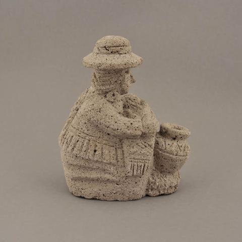 Piedra volcánica tallada representando a una mujer andina sentada con niño en brazos y jarron junto a sus pies. Detalle del sombrero, trenza larga e incisiones que definen una manta en su espalda y envolviendo al niño. Superficie grisácea porosa.