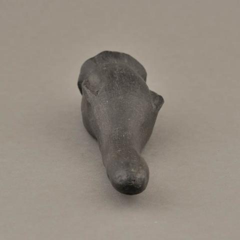 Figura de cerámica modelada de cuerpo ovalado y apéndice alargado. Detalle de melena que acota la cara. Boca tubular, orificios a modo de ojos y dos pequeñas "aletas" a los lados del cuerpo. Superficie negra pulida sin decoración.