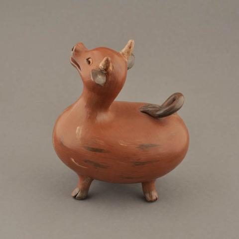 Figura zoomorfo de cuerpo globular y patas cortas con pezuñas marcadas. Cola curvada simula movimiento, inciciones en la punta. Ojos y nariz mediante perforaciones. Boca abierta, detalle de lengua. Superficie pulida y engobada con pequeñas inclusiones de color en cachos, orejas, pezuñas, cola, boca, lengua y pincelados en el cuerpo. Finas terminaciones.