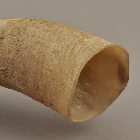 Asta de vacuno en proceso de manufactura para instrumento musical de viento. Superficie rugosa debido a pulimento incompleto. Corte recto en un extremo para supuesta inserción de caña de bambú.