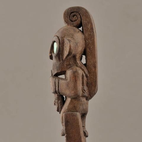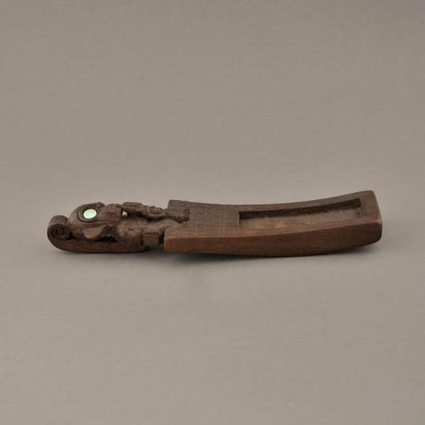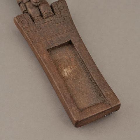 Objeto oblongo de madera compuesto por una sección rectangular con cavidad central y figura antropomorfa tallada sobre el borde superior que representa al "sacrificador" de la cultura Tiwanaku. Aplicación de pierda color calipso en los ojos. Detalle de grandes orejas, dientes a la vista, en una mano un hacha, en la otra una cabeza.