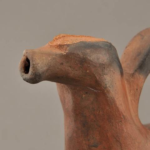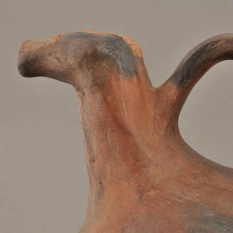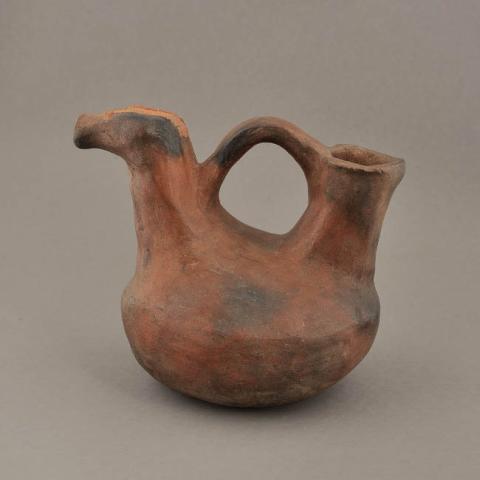 Vasija de cuerpo lentiforme y base de pedestal. Vertedero cilíndrico de cuello alto levemente en diagonal unido mediante asa puente al cuello de un ave, probablemente una gallina, cresta faltante. Orificio central en protuberancia a modo de boca. Factura irregular. Superficie pulida y engobada sin decoración.