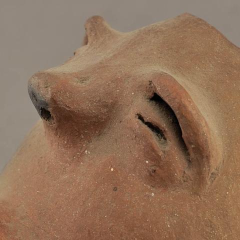 Vasija de cuerpo globular ovalado. Base plana levemente extendida. En la parte superior orificio central. En la cara frontal, ojos rasgados descritos en la arqueología como "granos de café", cejas pronunciadas, protuberancia central con dos perforaciones como nariz y orificio circular a modo de boca. Hacia la zona inferior, dos medialunas horizontales en sobre relieve. En la zona posterior, asa cinta vertical. Superficie alisada y engobada sin decoración.