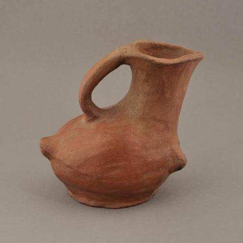 Objeto de cuerpo ovalado y base cilíndrica plana de borde irregular. Cuello alto, boca restringida de labio recto apuntada hacia el vertedero. Un asa cinta borde/cuerpo. En el cuerpo bajo el vertedero, dos protuberancias cónicas a modo de pechos de mujer. Bajo el asa, opuesto a la boca, terminación en sobre relieve simula una cola. Superficie alisada y engobada sin decoración.
