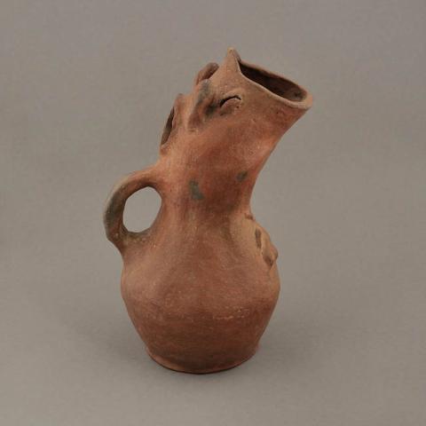 Objeto de cuerpo globular y base plana. La parte superior del cuerpo, se adelgaza para dar forma a un cuello largo levemente curvado que termina en una boca ovalada de borde recto. En su extremo superior apéndice con dos perforaciones como nariz. A ambos lados, ojos rasgados conocidos en arqueología como "granos de café" bajo orejas las que simulan rostro zoomorfo. En el cuerpo, detalle en sobre relieve a modo de pectoral posiblemente una flor o arácnido. En la parte posterior orificio circular, bajo él asa cinta vertical cuello/cuerpo. Superficie pulida y engobada sin decoración.