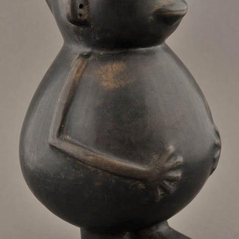 Ceramio antropomorfo parado sobre sus dos piernas, dedos de los pies mediante incisiones. Cuerpo globular, brazos flectados y manos sobre el vientre. Cejas, nariz y boca en sobre relieve. Detalle de perforación en la nariz. Ojos cilíndricos. Orejas mediante protuberancias ovaladas, con dos hendiduras y un orificio central. Vertedero en la parte posterior de la cabeza. Superficie negra opaca pulida y engobada sin decoración.