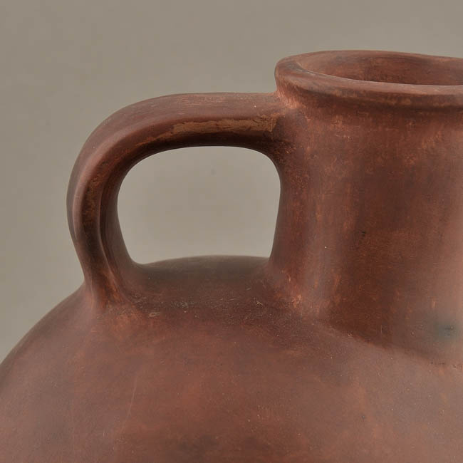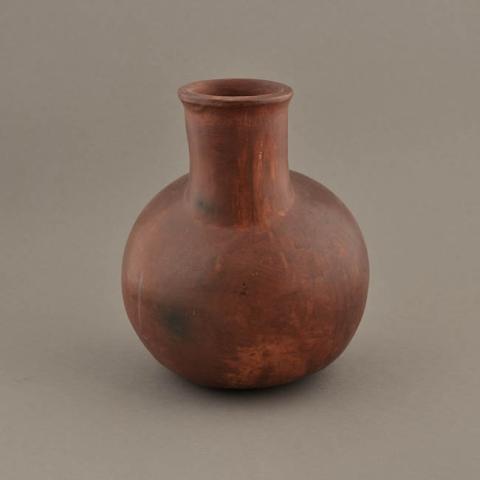Objeto de cuerpo globular y base plana. Cuello largo, boca restringida, borde recto. Asa cinta desde el cuello hasta el cuerpo. Superficie rojiza opaca pulida y engobada sin decoración.