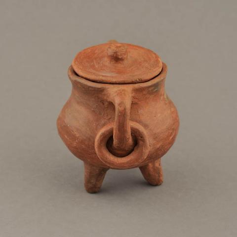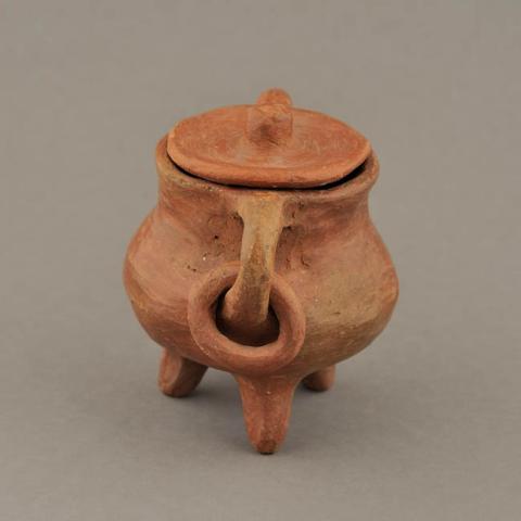 Ceramio de cuerpo globular y tres patas apuntadas. Cuello corto de borde levemente evertido, boca restringida y labio redondeado. Dos asas desde el borde hasta el cuerpo, en ambas argolla. Tapa circular con apéndice cilíndrico central. Superficie alisada y engobada sin decoración.