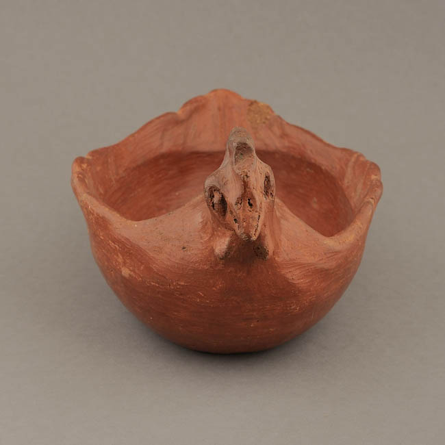 Contenedor cerámico de cuerpo ovalada y base plana que representa a una gallina. Detalle ondulante en el borde a modo de alas y terminación apuntada como cola. Rostro de gallina opuesto a la cola. Detalle de cresta, barbilla y pico. Superficie alisada y engobada sin decoración.