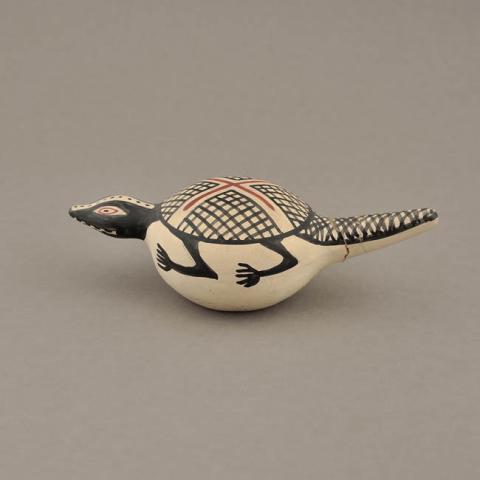 Figura cerámica que representa un lagarto formado por un cuerpo lentiforme del que se desprende un apéndice ovalado apuntado a modo de rostro y una protuberancia alargada como cola. Superficie pulida y pintada blanca sobre la cual se dibuja con pintura negra y roja el reptil. Detalle de cruz central roja en el cuerpo y manos y pies de cinco dedos.