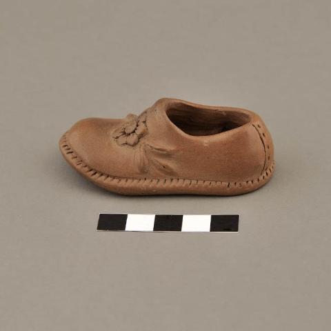 Figura cerámica que representa a un zapato tipo mocasín. Borde delimitado con incisiones como sueña. Aplicación de flor en sobre relieve en la zona que cubre el empeine. Perforaciones como costuras en el talón. Superficie bruñida y engobada sin decoración.