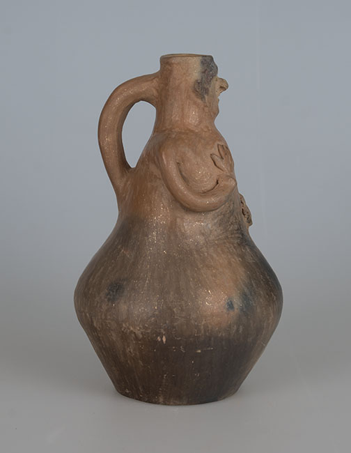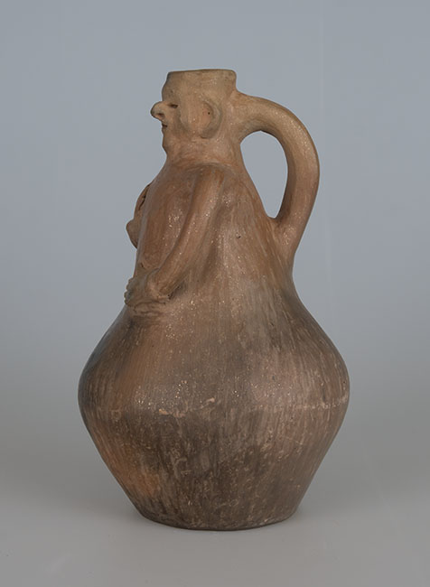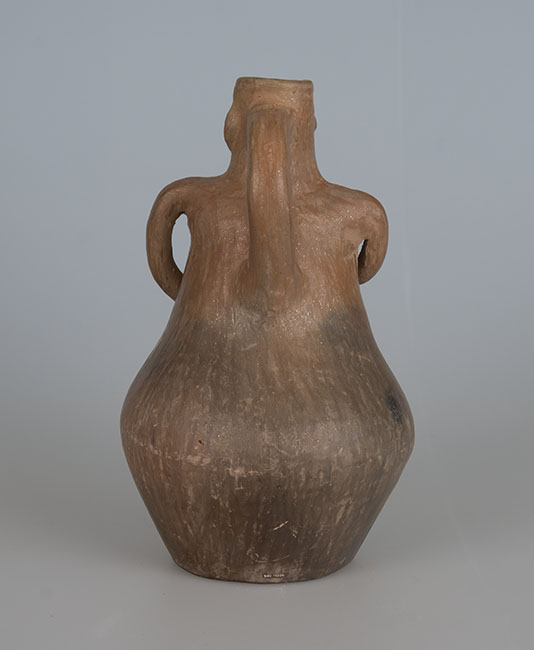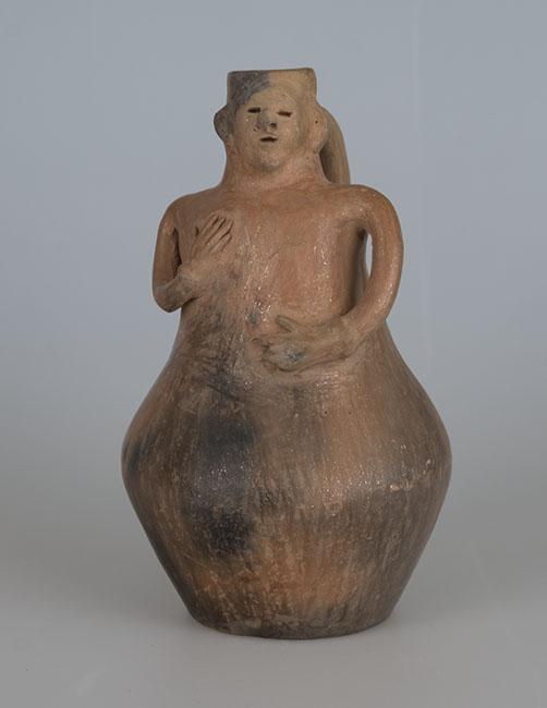 Ceramio de cuerpo globular y base plana restringida. La parte superior del cuerpo representa el torso de una mujer, ambos brazos flectados: una mano sobre el pecho, la otra en la cintura. Rostro sobre el cuello corto, de labio recto y boca restringida. En la parte posterior un asa cinta cuello/cuerpo. Pasta clara. Manchas oscuras producto de la cocción. Superficie alisada y engobada sin decoración.