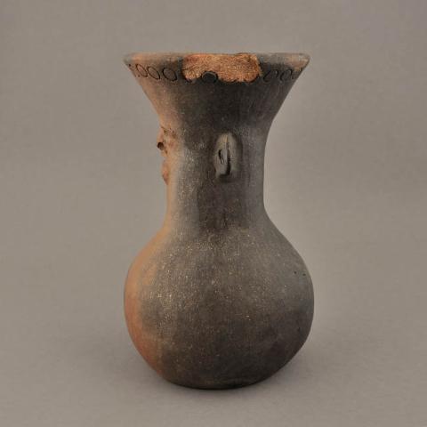 Ceramio de cuerpo globular y base plana. Cuello largo de borde evertido y labio redondeado. En el cuello rostro antropomorfo. Protuberancias semi circulares a ambos lados a modo de orejas. Círculos concéntricos incisos como pendientes. En el borde, franja de círculos paralelos. Pasta anaranjada, zonas más oscuras producto de la cocción. Superficie pulida y engobada sin decoración.
