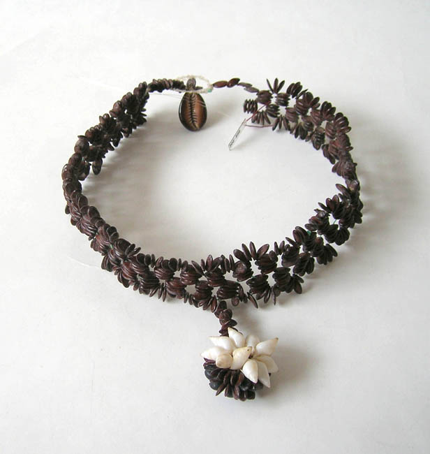 Adorno personal usado alrededor del cuello compuesto por semillas de color café tejidas con hilos que forman una cinta ancha y que en el centro tiene un colgante circular en forma de flor de caracoles blancos marinos y semillas café.