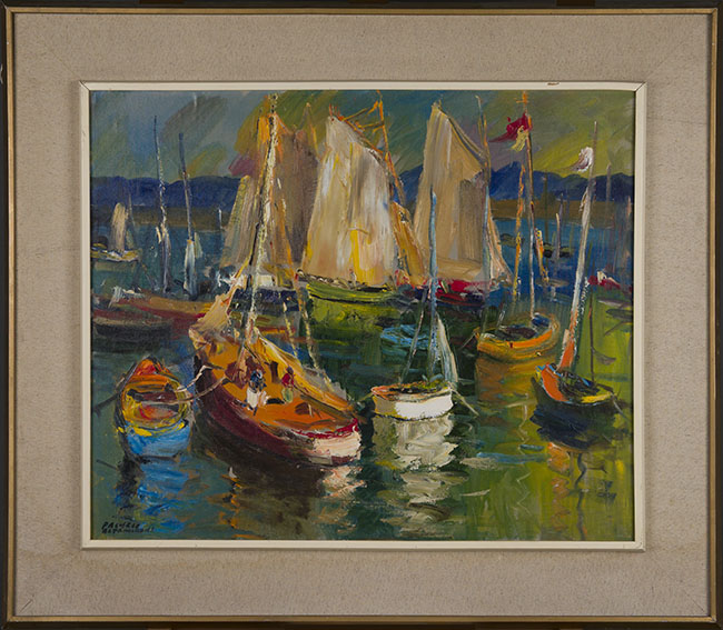 Obra bidimensional en color de formato rectangular. Composición en base a paisaje porteño con embarcaciones de diversos tamaños y colores. En primer plano cuatro embarcaciones, tres a vela, de colores predominantemente naranja, blanco y negro cada uno respectivamente, y un bote de color azul; en segundo plano cuatro embarcaciones a vela de color anaranjado; en tercer plano tres embarcaciones con las velas de color blanco desplegadas, una de color verde y otra rojo. En cuarto plano una cadena montañosa.