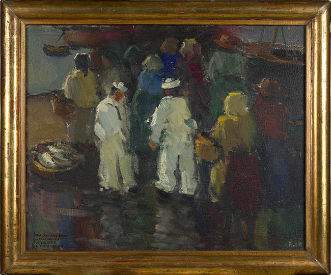 Obra bidimensional en color de formato rectangular. Composición en base a un paisaje porteño con un grupo de figuras antropomorfas. En primer plano una figura femenina de espaldas, viste de rojo oscuro con amarillo, lleva la cabeza cubierta, en segundo plano un canasto con peces, dos figuras masculinas vestidas de blanco y una femenina que viste de color azul y rojo oscuro. En tercer plano un grupo de siete figuras antropomorfas y tras ellas la línea costera con vistas parciales de embarcaciones.
