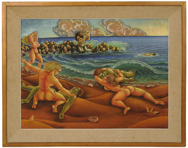 Obra bidimensional en color de formato rectangular, composición en base a paisaje costero. En primer plano en la playa dos parejas, la del costado derecho compuesta por una figura masculina color verde tendido de espalda en el suelo con los brazos extendidos, junto a el una figura femenina arrodillada de espaldas, su brazo derecho está posado sobre el hombro de la figura masculina.